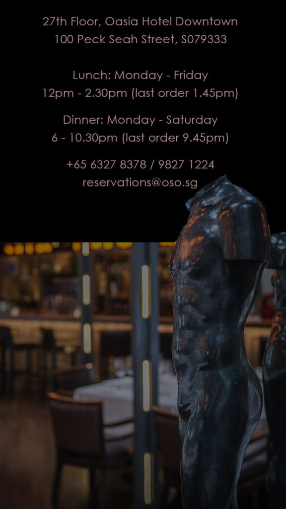 For any reservation more than 8 persons / Private rooms inquiries please call or whatsapp us at +65 9827 1224 or email us at reservations@oso.sg.